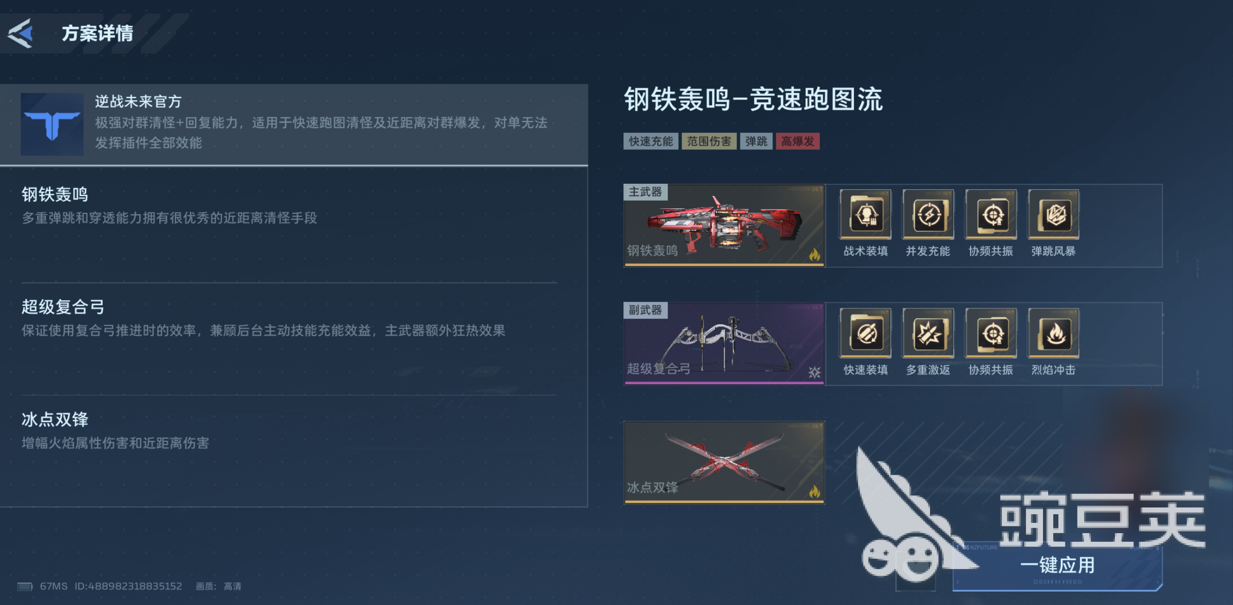 针对中后期成型阶段,推荐采用“战术装填+并发充能+协频共振+弹跳风暴”四件套组合。该方案显著提升换弹速度与技能连发稳定性,同时增强爆炸半径与穿透后的二次伤害倍率,契合武器高频率反弹与连锁爆发的使用逻辑。而在前期资源尚不充裕时,建议优先选用“负压弹夹+连锁充能+叠浪效应+霜滞协议”,这套配置通用性强、获取门槛低,适用于多数火系与穿透型武器,兼顾过渡实用性与成长延续性。