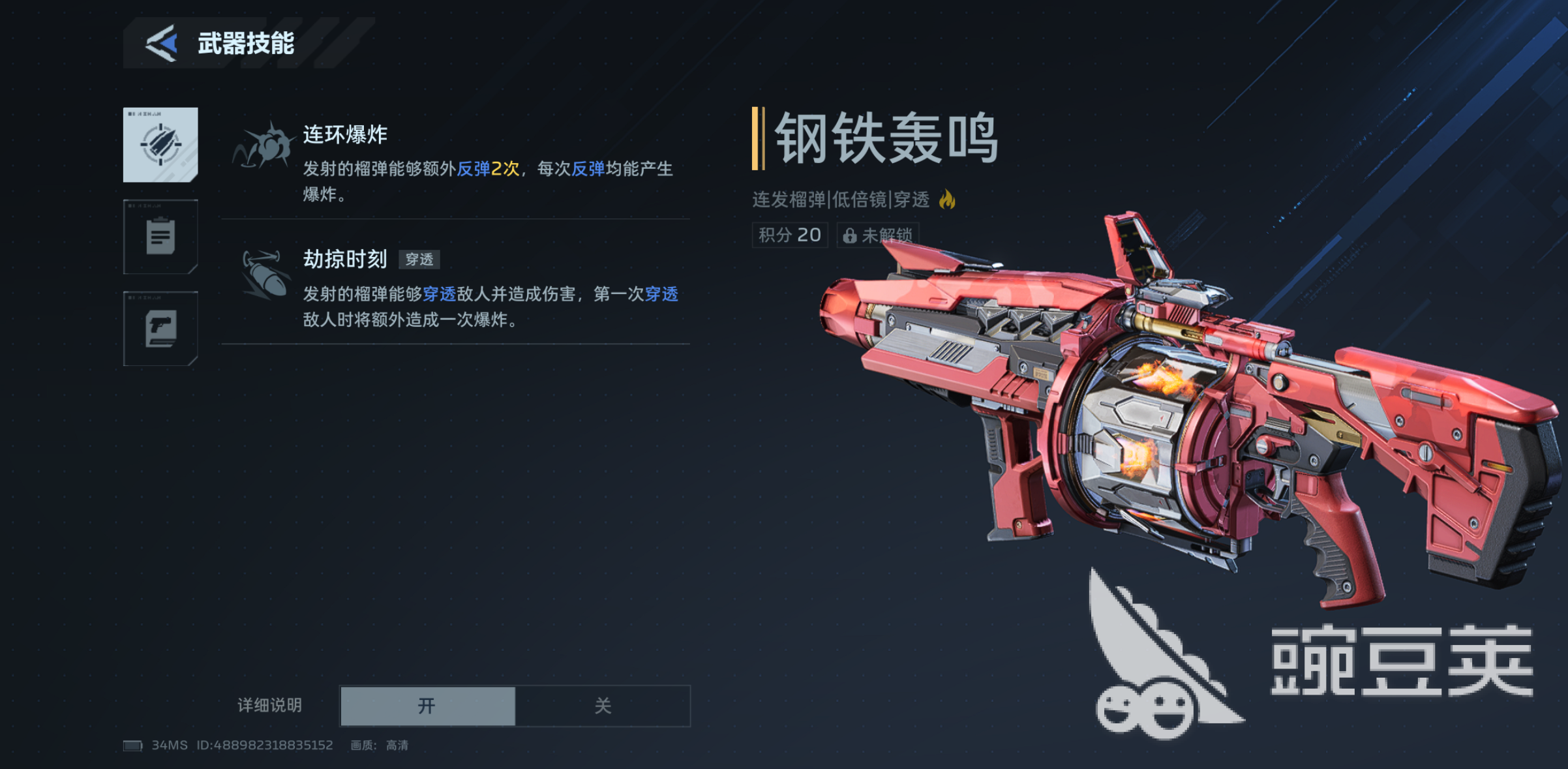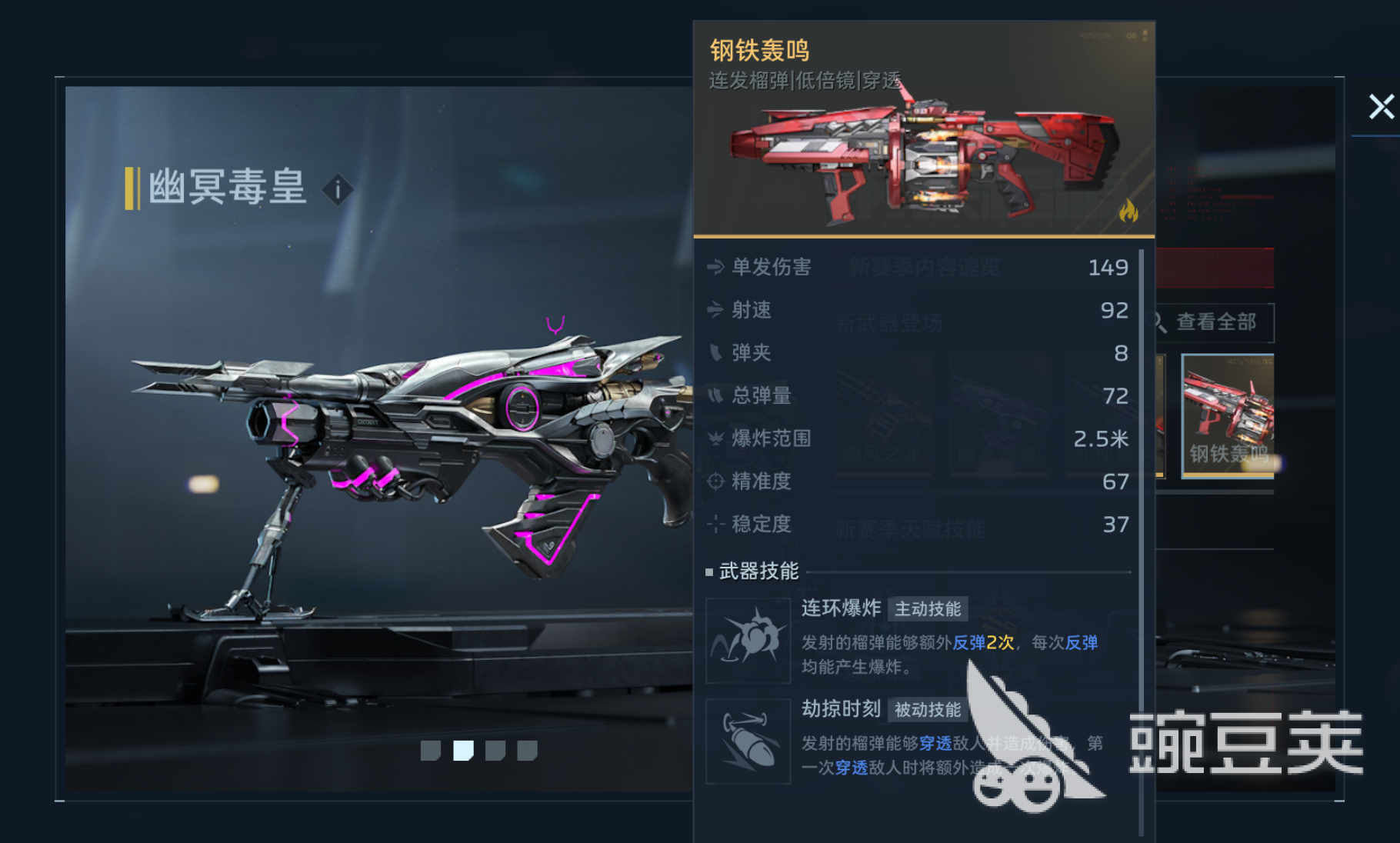 从技能设计来看,“钢铁轰鸣”具备鲜明的火系特性:主动技能可反弹榴莲弹,并在每次反弹时触发范围爆炸;被动效果支持穿透攻击,对首个穿透目标额外附加一次元素爆发伤害。整体定位偏向中远距离持续压制与多目标打击,但单发基础伤害与弹匣容量相对有限,因此配件搭配需重点强化装填效率与爆发输出能力。