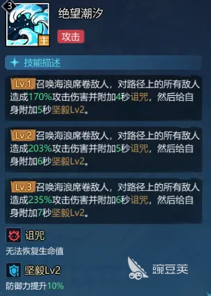 核心技能“绝望潮汐”可召唤持续推进的海浪,对路径上全体敌人造成170%攻击力的伤害,并附加2秒减速效果;同时施加持续4秒的诅咒状态,使目标无法恢复生命值;技能释放后,爱丽儿自身获得持续5秒的坚毅效果,提升10%防御力。