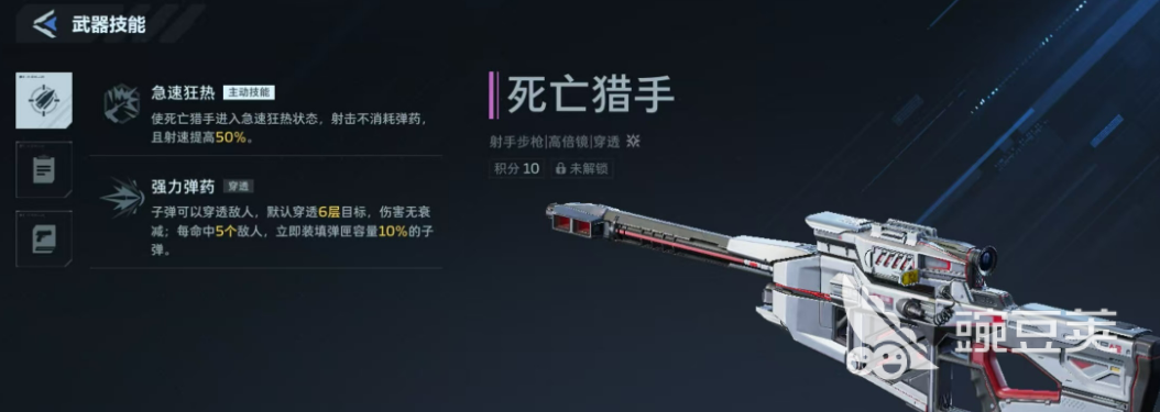 作为射手步枪,死亡猎手支持装配高倍率瞄准镜,单发伤害处于同类武器前列,且具备优秀的墙体穿透性能。其核心机制由两个主动技能构成:技能一【急速狂热】可令射击不消耗弹药,并提升50%射速,持续期间实现持续火力压制;技能二【强力弹药】赋予子弹穿透能力,默认穿透6层目标,且每层伤害无衰减;更关键的是,该技能触发后,每命中5名敌人即自动恢复10%弹匣容量,大幅缓解持续作战中的补给压力,尤其适用于密集僵尸群或高波次防守场景。