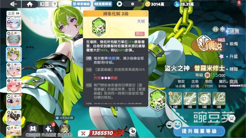 缚像化解为关键防御型技能,随技能等级提升,逐步增强对敌方暴击伤害的削弱比例,最高可降低145%暴击伤害加成。该效果在面对以爆伤为核心输出体系的敌方阵容时尤为关键,大幅提高队伍容错率;当技能升至红色三星后,将激活额外吸收机制,进一步强化其对抗高爆发单位的适应性与培养上限。