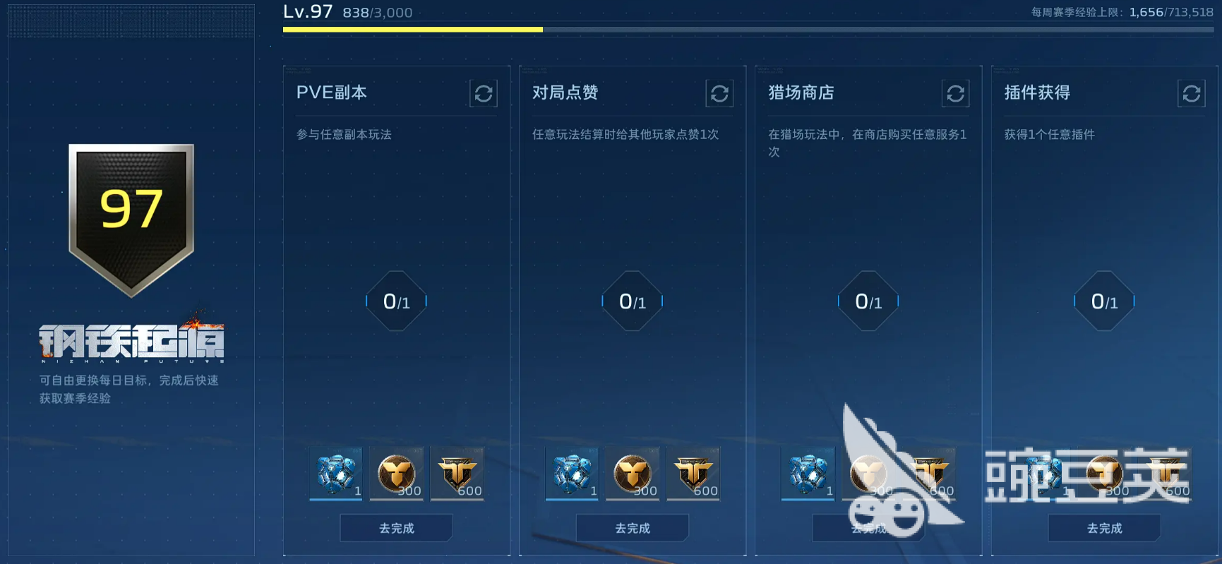 通行证升级依赖稳定的经验供给,主要来源为每日四类常规任务,覆盖PVP竞技场与PVE猎场双场景,部分任务可在大厅内一键完成,操作门槛较低。系统设有周经验上限机制,即每周最高可获得16800点经验,而每提升1级固定消耗1600点经验,因此单周理论最高等级增幅为10级。若遇到难度较高的任务目标,玩家可点击任务栏右上角的刷新按钮更换任务条目,灵活选择完成路径。此外,任务结算时同步发放赛季经验、钛金跃迁秘藏等附加资源,形成多重收益叠加效应。