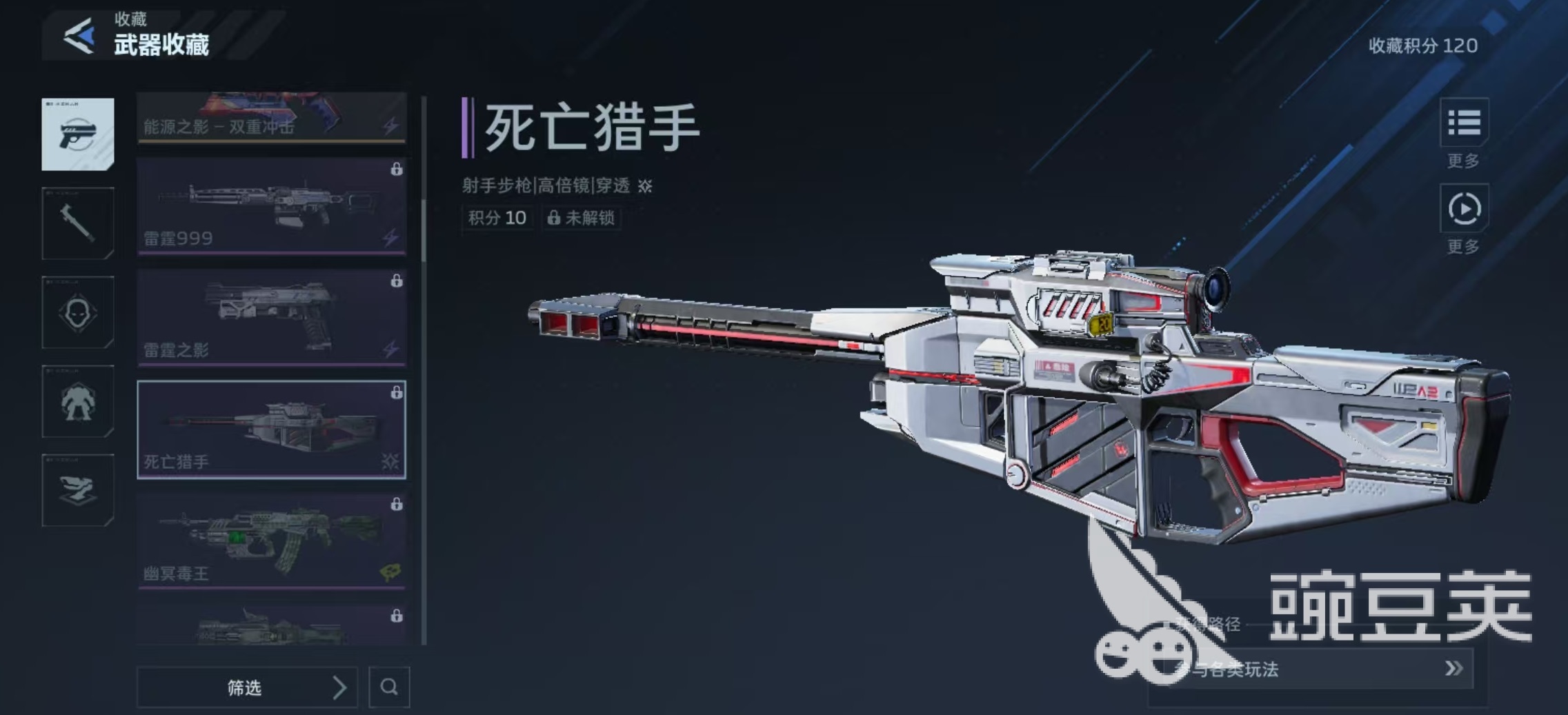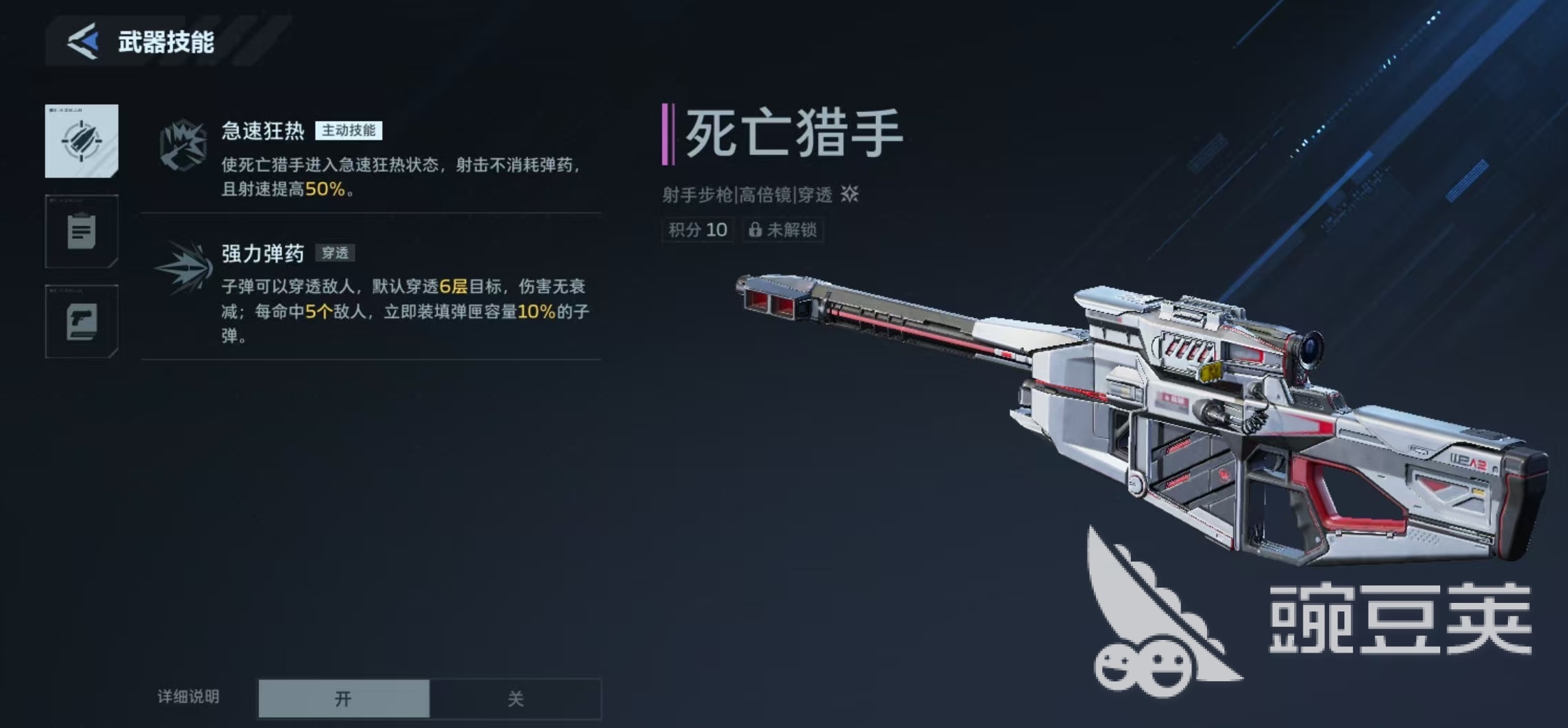 进阶外观“死亡猎手狩”需通过解锁钢铁起源通行证获取,整体配色升级为银白色调,强化科技感视觉表现。核心战斗属性保持一致:支持高倍率瞄准镜,单发物理伤害突出,且拥有两项专属技能——“急速狂热”状态下射击不消耗弹药,射速提升50%;“强力弹药”使子弹默认穿透6名目标,全程无伤害衰减,且每命中5个敌人自动补充10%弹匣容量。