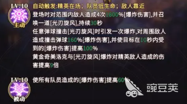 黄金奇美洛克的主动技能在触发的时候也是有着要求的,只有有精英敌人在场或者是队员的生命值过低以及有敌人接近的时候才会自动释放,当战场上出现任意满足黄金奇美洛克上场的条件时,她都会自动对敌人发起攻击,当黄金奇美洛克上场后会对范围内的敌人造成1800%的爆炸伤害,注意爆炸伤害一共会进行4次哦,并且还会召唤出一道光刃旋风来攻击敌人,技能可持续30秒,只有要弹球撞击到光刃旋风都会引发一次爆炸,可对周围的敌人造成撞击弹球160%的爆炸伤害,受到冲击的目标在10秒钟的时间内所受到的爆炸伤害会在次提升100%,对于精英敌人造成的伤害依旧是9倍提升。