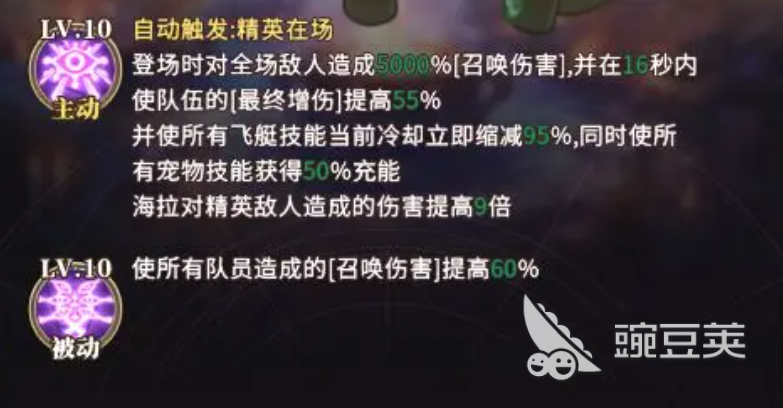 海拉的主动技能会在有精英野怪出现的时候自动触发的,当海拉登场以后会适用召唤技能直接对全场的敌人造成5000%的召唤伤害,还能够在16秒的时间内让队伍的最终增伤提升55%,此外,海拉在场的时候还可以让所有的飞艇技能冷却的时间算短95%,注意这个缩短效果是立即的,同时所有的宠物技能还将会获得额外50%的充能,海拉对于精英敌人所造成的伤害在原本的基础上直接提高9倍,这也让海拉成为精英敌人的克星。