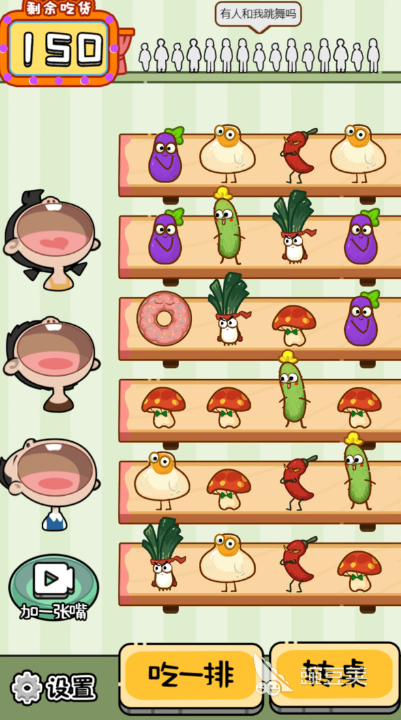 本作突破传统单角色进食设定,支持同时操控多名大胃王角色协同进餐。游戏采用旋转餐桌机制,玩家可自由调整转盘角度,使不同角色实时获取新菜品;进食速率亦可自主调节——既可一口吞下整盘料理,也能逐格扫清一整排食物。整体美术采用Q版卡通风格,配乐轻快,内置完整图鉴系统,便于玩家熟悉各食材特性与通关逻辑。