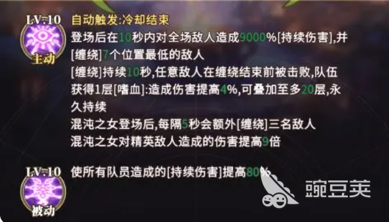 混沌之女的主动技能能够让混沌之女在把敌人给击退以后获得能够永久性提升伤害的嗜血效果,该技能为自动触发类型技能,当混沌之女登场以后会在10秒钟的时间内对场上的全部敌人造成9000%的持续伤害,并且还能够用缠绕能力将位置最低的7个敌人给缠绕起来,缠绕可以持续10秒的时间,只要有敌人在缠绕结束之前我方击败,那我方队伍就能够获得1层嗜血的能力,该能力可以使伤害提高4%,伤害提升效果可以叠加,最多能够叠加20层且永久有效,此外,混沌之女上场以后还会每隔5秒钟的敌人在额外的缠绕3名敌人,对于精英敌人所造成的伤害会直接提升9倍。