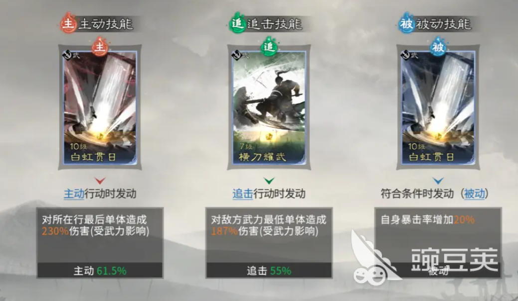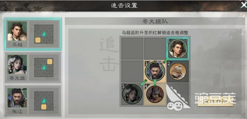 然后张辽的话,在这里可以带白虹贯日之类的技能,对面的敌人造成输出的时候,是根据所在行列的敌人,对他造成输出之后还可以根据张辽自身天赋带来足够的点杀能力,后期追击的话,大家可以带横刀耀武,这个技能对敌方目前武力数值最低的一个目标来说,造成的伤害是能够达到最高数值的,蔡文姬在这个阵容里面就是辅助定位的角色,她能够带来的一个主力技能就用鼎力相助技能,这样的话就可以让踩中追击格子的武将带来足够的伤害加成。