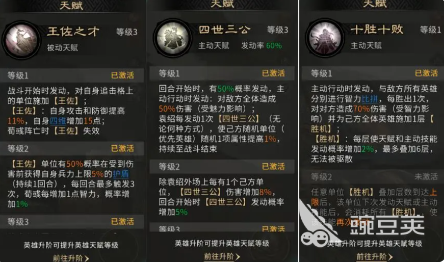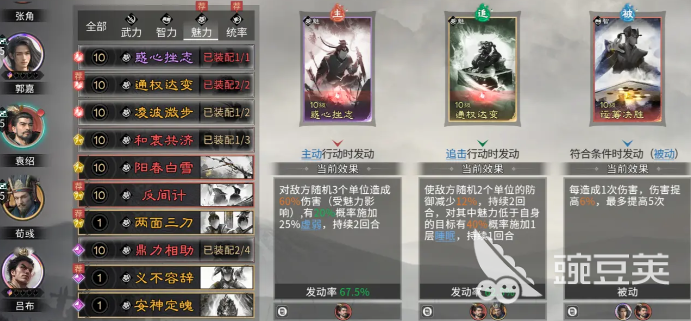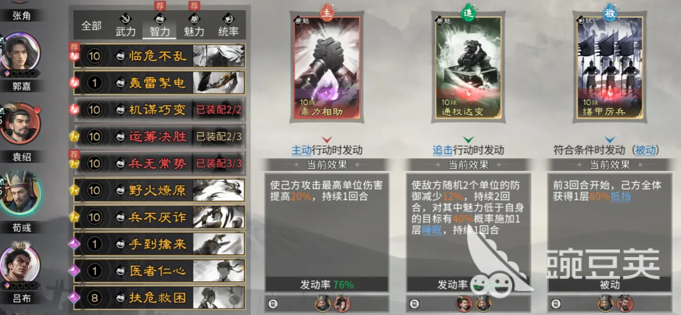 一开始袁绍他的自带天赋四世三公还可以给敌人造成群伤能力,之后搭配过荀彧的王座之才,这样对武将造成属性升级之后,大家就不用担心郭嘉他自身的天赋能力了,他的天赋效果上面有一个十胜十败,这个技能可以提升我方在天赋能力上面的发动概率,所以这个阵容里面其实大部分武将在输出的时候,都是依靠这里的群伤进行输出的,袁绍这里带技能的话,大家可以带的是惑心挫志、通权达变还有运筹决胜,这几个技能基本都是比较符合原始和自身技能效果的,他大量的群伤能力也可以给敌人施加更多的虚弱状态,然后追击能力上面还有一定的概率可以带来睡眠的控制效果,且首次受到对面伤害的时候,他还可以带来额外的增长数值,被动效果上面用这个运筹决胜可以给他的天赋带来多次触发的增益效果。