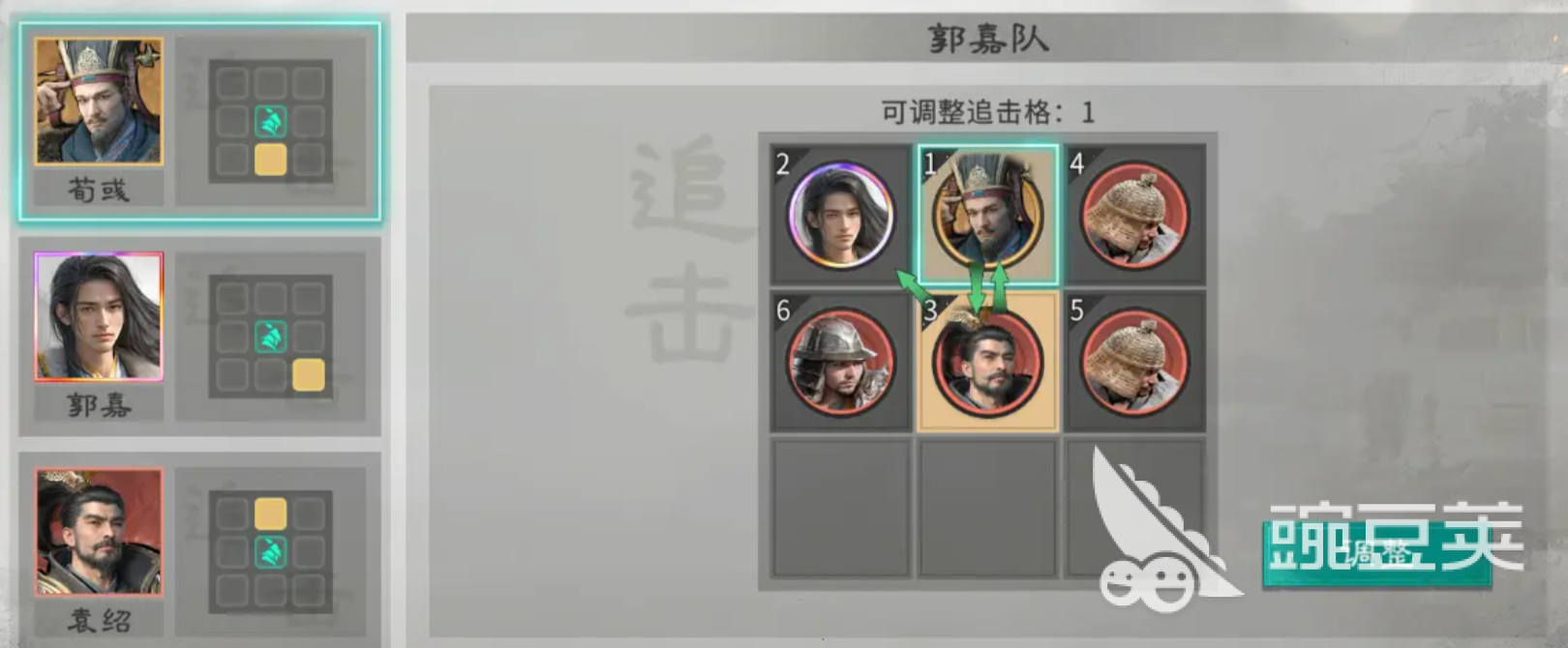 到阿还可以为袁绍搭配一个郭嘉作为副c的武将来进行输出,郭嘉用来不伤害的话,其实可以带来的提升技能效果非常高,他一般情况下可以为队伍里面的武将带来技能释放概率上面的补充,然后再搭配一个荀彧,荀彧可以进行辅助类型的增益提供,所以在这里如果大家对荀彧配队能力比较难把握的话,就依靠小编这个阵容来进行搭配就可以了,在这里袁绍的效果上面其实是可以发动自己更多次的天赋能力,所以造成的伤害数值上面不仅是有群体类型的伤害,还可以给所有的队员都带来足够的增益能力,这里越打越强的时候,袁绍他可以带来的一个输出数值自然也会越打越高,后排的话大家要注意,在站位的时候,后面一定要放单穿杨军,这样的话可以给队伍带来足够的输出补充,然后藤甲兵的话,前面抗伤是比较固定的兵种搭配。