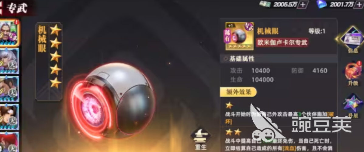 机械眼是欧米伽卢卡尔的专属武器,这把专属武器的基本属性非常的漂亮,攻击力有10400点、防御力4160点、生命值104000点,可以说欧米伽卢卡尔在装备上机械眼以后,不仅能够增强他的输出伤害,还能够狗让队伍的暴力得到增强,该专武床被上以后,在战斗刚开始的时候就能够给队伍中除了自己以外攻击力最高的3个伙伴附加上破坏能力,增强队伍的伤害,而武器在二星以后还能够让自己的最终免伤提升15%。