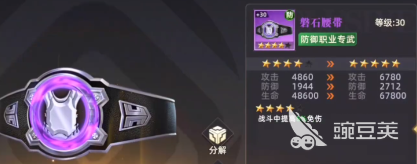 磐石腰带时防御类型职业的专武,别看盘是要带只是紫色品质的专武,可是它的属性却非常的不错,磐石腰带虽然攻击力和防御不是特别的出色,可是它的生命值却非常的高,在战斗中还能够给角色的免伤效果提升6%,在升星以后,磐石腰带的产生的效果还会变得更好。