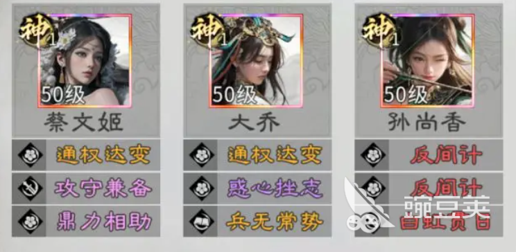 这里的藤甲兵放前排的话可以给我方的核心能力带来一定的保障,而其他两个兵种的话,大家都可以选择是陷阵营,更适合目前追击队需要的机制以及能力,而另外在英雄获取的门槛上面这里三个武将获取难度都不算很高,当然其中除了核心孙尚香之外,其他的辅助位置大家如果没有蔡文姬的话,也可以使用黄月英来替代,具体选用的武将取决于当前目前自己手中女性武将的觉醒进度,并且有足够辅助能力才能够提升孙尚香的追击次数,这样才能够达到足够的输出强度,后期在觉醒进度上面如果更高的话,其实也可以让整体品质提升更多一些,比如说孙尚香的天赋效果,想要用好的话,一定是要对单体敌人进行伤害的,但是这里毕竟是随机选中目标,所以缺乏一些快速清除的能力。