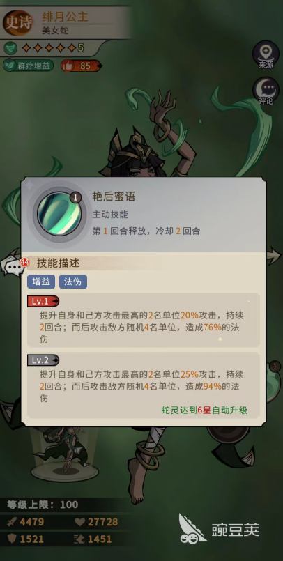 绯月公主的第一个核心技能就是艳后蜜语,一开局大家就可以直接用,此时可以给自身以及周围攻击最高的两个队友套上20%的攻击加成,然后紧接着还能随机的找到四个敌人作为攻击目标,为这个群伤带来的是76%的法术伤害,当然大家用的时候要注意,技能当中有一个细节,就是绯月公主带来的这个增伤buff跟后续可以带来的群体伤害其实是绑定触发的,所以先手用这个技能就相当于先给绯月公主充能量,此时给对面的群体带来基础的输出之后,就可以连接后期的其他输出技能用,等到绯月公主升到6星的时候,这个技能直接提升到了25%攻击加成以及94%的法伤加成,这里数值上涨的还是比较多的,且在其中大家用这个群体伤害的时候,也要注意她后期达到三级之后,这个技能也是看看一吃暴击率以及法穿属性的,就是玩到后期绯月公主是一定要注意自己的站位问题,如果一开场就被对面蛇灵给切了的话,是达不到后期强度要求的,所以这里大家需要给她准备一些有防护效果的蛇灵进行搭配。