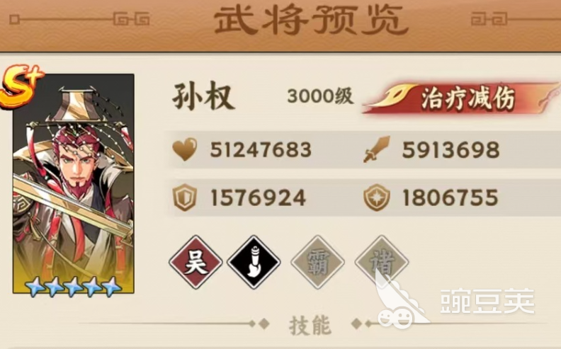 孙权的主要技能基本上都是为队友恢复伤害,在施展怒气技能之后,可使己方生命值最低的三个角色大量回血,并给他挂上持续回血的buff。当孙权达到五星的时候,战斗开始的时候,孙权自身可以免疫一次控制效果,同时减少所受到的主动伤害。当达到九星的时候,与孙权站在同一列的所有武将都可以提升自身的减伤比例。达到英杰一星的时候,第1次退场时可以降低敌方的攻击力。