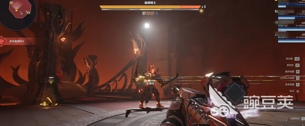 血量低于临界值时,幽魂骑士将浮现红色虚影并发动高伤大刀斩击,该技能具备全屏范围与极高伤害系数。建议全体回避,待其动作结束、恢复常态后再重新接续输出节奏;瞄准头部区域进行精准扫射可显著提升击杀效率。
