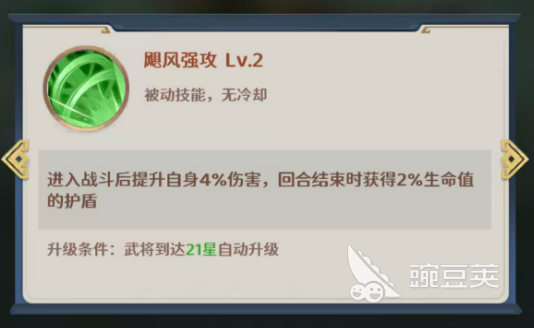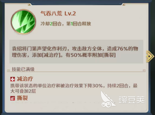 另外他的被动技能效果当中有一个飓风强攻,这个技能是根据战斗当中自动触发自身14%的伤害提升,在他行动的回合结束了之后,自身还可以获取2%的生命数值,上面提取出来的这个护盾其实后期在21星的时候可以升级成更高的百分比,要不然这里其实2%的护盾数值还是太低了,只能给他作为一个基础的格挡作用的,另外在他双重能力共享的两个回合持续时间里面,其实在敌方治疗单位关键的时期是可以稳住我方战力效果的,当然这里减疗的效果可以叠加的这个特性也是可以让袁绍在其中多次释放的,当然这里减疗的效果可以叠加的这个特性也是可以让袁绍在其中多次释放自身的技能效果,带来多层的致命影响的,放在这里使用的话,他的成长上限还是蓝色品质武将里面比较多的,