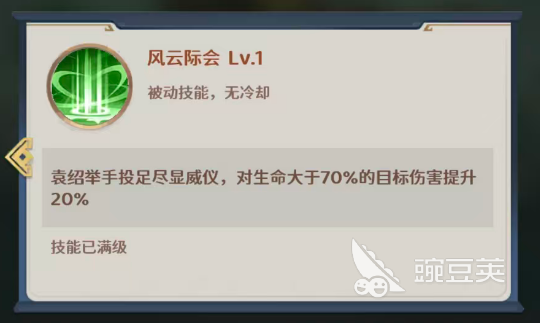 那么第三个技能叫做风云际会,这个技能是没有冷却时间的,再次被动触发的话,可以根据他当前的使用效果,对于生命数值大于70%的目标可以带来20%的伤害提升,后期没有什么升级的空间,那么这里使用的话,其实风云际会带来的核心技能效果还是要根据第一个技能的能力带来全体打击的效果,在这里虽然物理效果虽然看起来比较平稳,但是结合了他的减疗以及撕裂双重能力来说的话,实际的战术效果还是远超于这里基础的数值,另外他还有一半的概率可以附加这个撕裂状态,每一层造成的攻击力带来的叠加效果都可以造成更高的间接伤害,这类效果针对于目前有扣血机制的敌人来说也是有一定克制的。