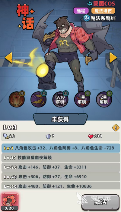 蒙面COS:如果是前期需要一些远程输出保护自己血量的玩家,其实完这个蒙面COS最适合,在魔法效果当中的增伤可以触发更多魔法系羁绊,场内可以召唤蝙蝠对3个目标造成60%魔法伤害,而且在蒙面COS进入战斗的时候,他还会派出3只小蝙蝠跟随蒙面COS以及当前出站队伍当中最高攻击的两名队友,这里跟随的小蝙蝠会根据当前追随的角色释放战技,其中每只小蝙蝠都会快速飞出,然后撕咬角色攻击的目标,一般是造成敌人身上20%魔法伤害的,后期大招会让其中每个角色跟随的1只小蝙蝠升级为吸血小蝙蝠,这里的吸血小蝙蝠造成的撕咬伤害会有1倍的数值提升,同时给对面带去眩晕敌人2秒的控制。
