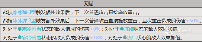 科技连击技能,让角色的战斗技能还有普通攻击就会形成完美的闭环,而一旦在触发额外的效果之后,下一次的普通攻击就会转化成重击。二阶解锁之后,就可以让这一记重击能够提升50%的伤害,大幅度强化单体爆发。冰点天赋则主要是聚焦于寒冷体系的伤害增幅,一阶对于寒冷附着敌人就会增伤9%,在冻结的状态下就会拥有翻倍的效果,在进入到二阶之后,增伤的比例就会直接提升到18%。让冻结控场和高额伤害就会直接形成良性循环。