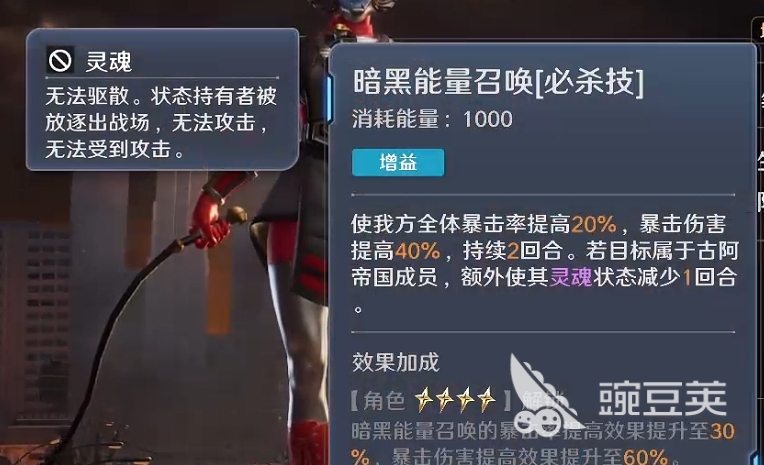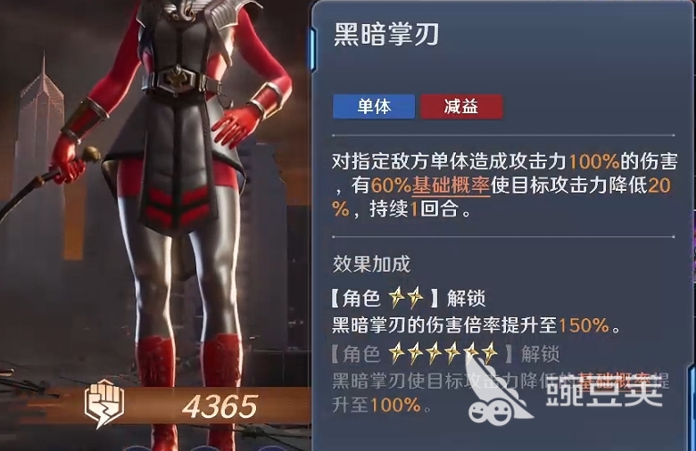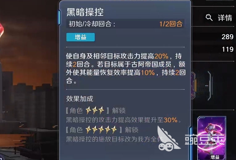 其中,主动技黑暗操控可让自身以及相邻的队友增加20%的攻击力,若队友为古阿帝国势力的角色,还可额外让他获得能量恢复效率提升10%的效果,算是一个既通用,又能让同势力角色获得额外收益的技能。另一主动技黑暗掌刃则可在对敌方单体造成伤害的同时,以60%的基础概率降低它的攻击力,让它没办法打出太高的输出,因此亡灵吉娜在战斗中通过会向敌方的主要输出点释放这个技能。此外,在亡灵吉娜升至6星后,原本60%的基础概率会提升至100%,亡灵吉娜每次攻击必定会导致敌方目标被挂上降低攻击力的负面。