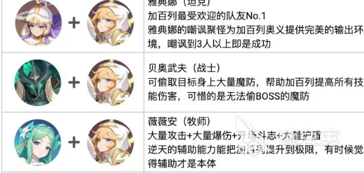 装备方面建议先选择爆伤套装,平均输出起码可以达到8307.8万。毕竟加百列本来就会拥有高暴击,堆爆伤收益是比较高的,其次就应该选择攻击穿透套,还有极速爆伤套。攻击套的表现比较差,不建议选择,具体的搭配可以选择圣骑护手,圣骑铁甲,圣骑头盔,圣骑战靴,还有鹰之战士肖像。可以最大化暴击伤害,还有奥义增伤,在阵容搭配方面,雅典娜就是最佳的队友。嘲讽聚怪就可以给奥义创造出完美的输出环境,薇薇安可以作为辅助,能够提供攻击,还有护盾等全方位的增益。梅琳娜可以降低敌方魔防,可以进一步的提升加百列的伤害。