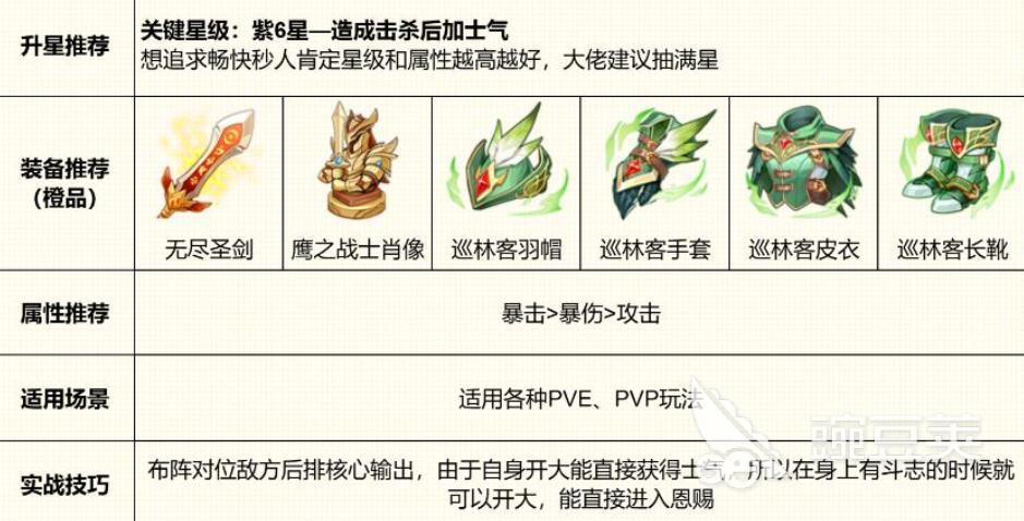 玩家在培养耶梦加得的时候,其实要做好取舍,比如玩家解锁击杀之后将会获得士气的被动效果,一旦处于这样的状态,能够快速的叠加。这时候将会进入恩赐的状态。在装备方面,建议玩家选择无尽圣剑,这样能够有效的堆叠暴击,额外还能够兼顾debuff的触发效率,以及少量的输出补充,因此玩家此时此刻将会进一步的强化耶梦加得。