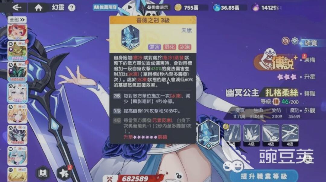 要说幽冥公主的天赋技能是冰系当中的核心所在,他在施展的时候往往会让整个团队的控场强度达到更高。一旦幽冥公主施加了寒冷,或者是敌人处于急冷、蒸发等等状态的时候。此时它可以有效地加一段自身攻击的魔法伤害,额外还会带4秒的冰冻,这时候单个目标8秒以内就能够直接触发一次,此时敌人直接被冰冻,基础的怒气回复效率也将会有效地降低。