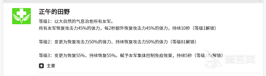 比如克拉拉在第一个技能正午的田野当中,可以带来所有友军身上都带来治疗的效果测试给全体队友带来恢复的数值,是根据她攻击能力上面45%的数值,带来这样数值恢复之后还可以每隔两秒之外,额外回复体力数值,持续10秒的时候,可以给所有的队友带来的恢复数值也是比较高的累积百分比,另外这个技能后期提升到等级三的时候,这里可以恢复的数值基础就达到了55%的数值,后期还可以给所有的友军都带来集体免疫控制的能力,当然克拉拉达到181等级的时候才可以解锁这个技能三的强度。
