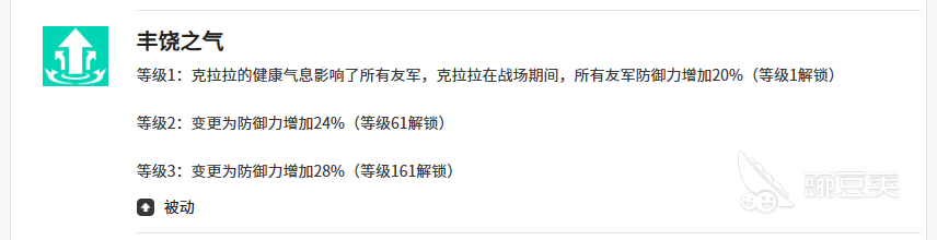 克拉拉还有丰饶之气的技能,这个技能效果其实是在场内期间有机会可以触发的,一般触发了这个丰饶之气之后,克拉拉可以针对所有我方队友身上的防御数值来进行提升,达到20%的提升之后,可以让我方在面对敌人输出的时候有更多的空间可以保证存活,那么在这里同样在最高的品质当中,能够达到的一个防御增加有28%,一般情况下是在敌方行动的回合才可以触发这个防御加成的。