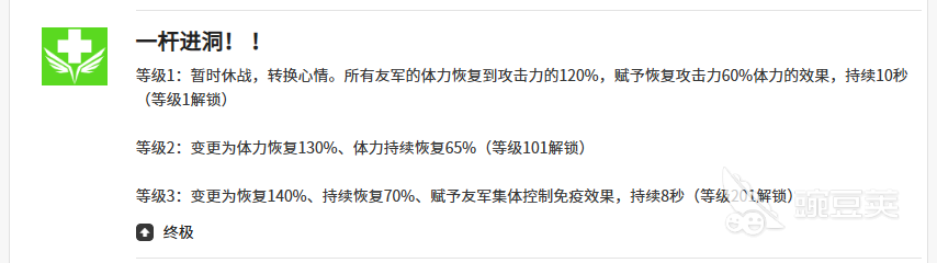 如果想要暂时休战的话,大家其实可以用的是克拉拉的一杆进洞技能,这个技能使用的时候,可以将所有友军的体力恢复到根据攻击力提升到120%的数值上面,这样有足够体力的时候还可以带来的一个效果会更强势一些,另外她后期带来的持续时间也有10秒时间,大家可以完全作为先手使用的状态来进行使用,后期接其他的输出技能是最好的。