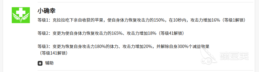 而小确幸这个技能其实针对克拉拉来说就是给自己带来足够的治疗恢复,这里她通过小学新技能会产生一个苹果,通过食用这个苹果,克拉拉可以给自身带来足够的攻击,体力恢复基本是根据克拉拉的攻击数值提取150%的数值来进行恢复。而且此时克拉拉不仅可以让自己的生存血量变得更多,还可以在后续的10秒时间之内通过16%的攻击加成来快速给敌人带来更多的伤害能力,达到等级3的时候,此时还可以解除自身的减益效果,这里解除的简易效果上面达到的百分比也有300%的数值。