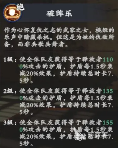 利用他的神龙功可以带来的招式能力当中,对于范围之内所有的敌人都造成93%的攻击效果,而且是连续10次的伤害,并且在此时还可以施加一个嘲讽,嘲讽敌人的时候,他的持续6秒时间可以让我方在攻击敌人的时候,每命中一次的时候,可以根据目标的移动速度来降低10%的持续时间,而在他后期搭配桃姬主要是因为桃姬自身的恢复能力是有出色能力的。而且桃姬还有一定的护盾能力,比如她的破阵乐技能,可以使全体的队友都获得护盾,这里是根据她数值提取出来的1100%的攻击护盾,那么这个护盾每1.5秒的情况下都会衰减20%的效果,持续的总时长一共达到了7.5秒,所以在其中护盾能够持续的时间也是非常长的。