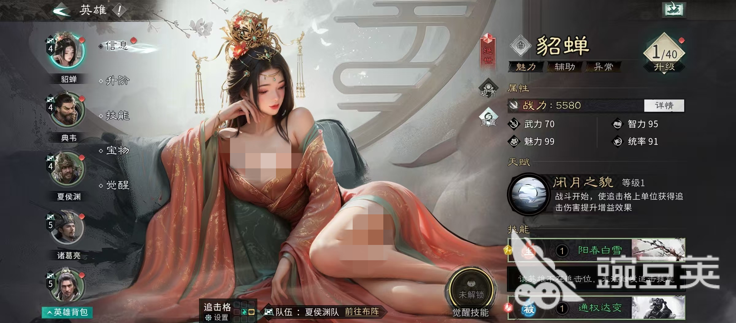 技能配置方面,许褚主选追击技【万军取首】,该技能具备高额单体伤害,并在兵力低于50%时触发额外伤害加成——契合许褚易损特性,实现高频增伤循环;被动技能首选【白虹贯日】,显著提升暴击率,配合暴击类宝物可达成稳定暴击输出。郭嘉主动技选用【兵无常势】,提升全队技能释放概率;追击技【临危不乱】增强残血反制能力;被动【运筹决胜】进一步优化技能联动效率。貂蝉主动技【通权达变】提供额外追击机会,被动【兵无常势】与郭嘉形成双重释放率加成,强化整套体系的技能运转流畅度。