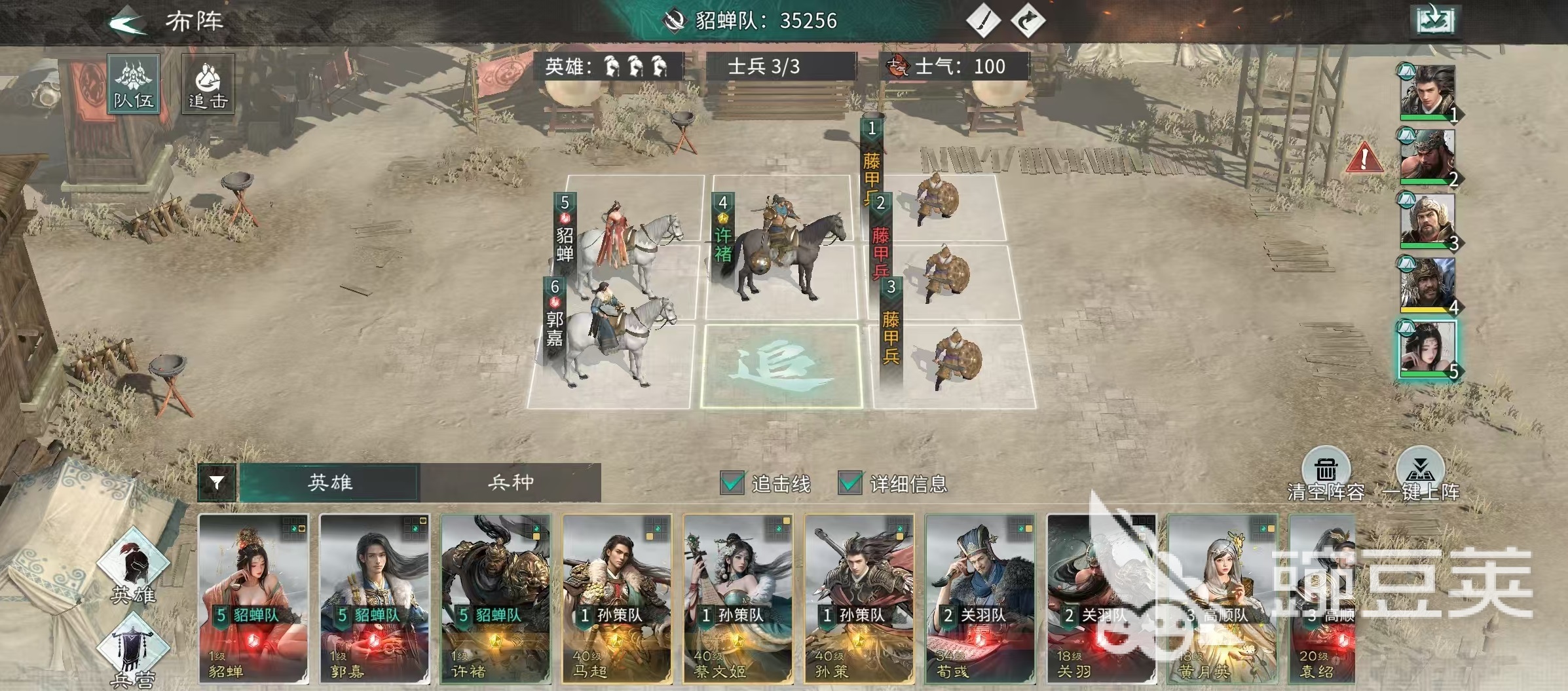 阵容布阵逻辑清晰:前排三格全部配置藤甲兵,集中承担伤害,保障后排武将生存空间;许褚置于中排核心位,确保技能命中率与输出环境;郭嘉与貂蝉分列左右,兼顾技能覆盖与协同响应。站位细节已在配图中标注,可直接参考部署。需注意,所有英雄需完成对应等级养成(含升星、技能解锁、天赋激活),方可完整触发点杀流机制效果。