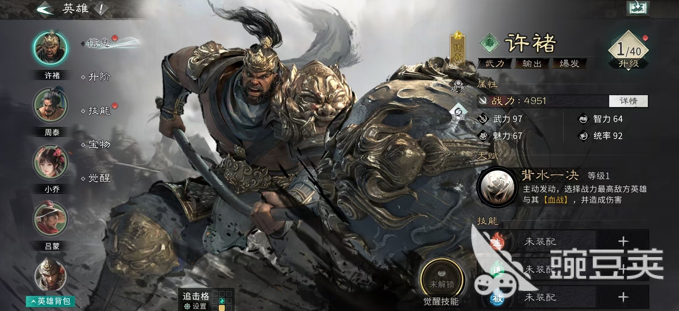 《三国天下归心》以高度自由的武将构建体系著称,每位武将均拥有专属天赋与觉醒机制,其余技能需玩家自主组合搭配,极大拓展了战术深度与实战多样性。本期攻略聚焦“许褚点杀流”阵容——以许褚为绝对核心,辅以郭嘉、貂蝉形成高效率单体斩杀体系,适用于PVP竞技场及高难度副本攻坚场景。