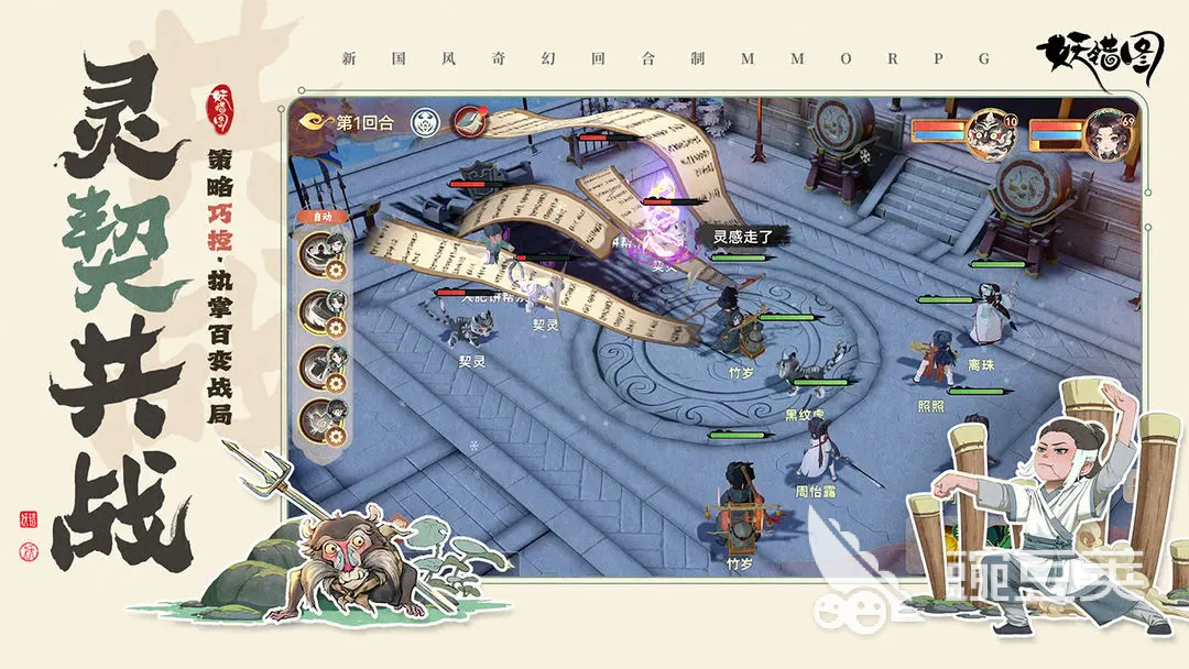 第二职业为「妖灵」,定位为中远程范围压制与属性干扰型输出。当前开放三位角色:卧云子、茹仙与参业。卧云子以笛音为媒介发动AOE伤害,并同步降低目标防御力,有效提升全队整体破防效率;茹仙使用铁环作为武器,具备高频率弹射打击能力,单次出手可连续命中多个敌人,输出节奏紧凑、覆盖率高;参业则依托双色佛珠构建复合输出体系——白珠主攻防御削减,黑珠专注暴击率与暴击伤害加成,二者协同释放可显著放大爆发上限。