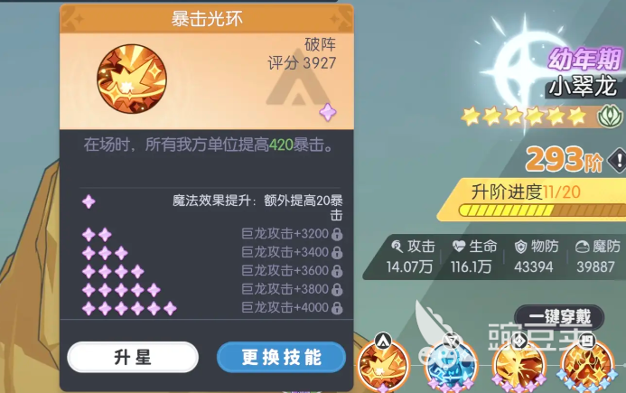 经换算,55.7%基础暴击率叠加42%光环加成后,综合暴击率可达97.7%。这意味着绝大多数攻击均可触发暴击效果,在实战中仅极个别情况出现非暴击判定。为确保该效果稳定达成,需关注两项关键细节:其一,小翠龙需完成深度培养——优先提升龙巢等级,并使其阶数达到293阶,此时暴击光环将额外获得+20暴击值。虽单次增幅有限,但在逼近100%暴击临界点时,此类补充极为关键。