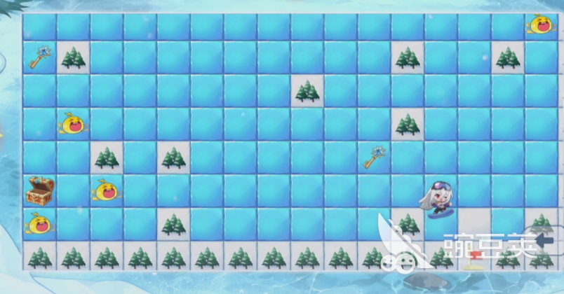 进入第五关后,请按以下顺序执行操作:起始位置向左连续滑行,直至抵达最左侧冰块靠近树木的底端;随后垂直向下移动,停在紧邻树干的位置;接着横向右移,依次经过三块冰面,在第四块冰块处暂停。前方即为史莱姆,此时向右绕行一格避开;再由该位置垂直上滑,抵达第三行第五列——此处冰块上放置着一把钥匙,拾取后沿当前行继续向右滑动,直至抵达同一行中出现史莱姆的冰块前再次绕行;绕开后,立即向下移动至下一行冰块。