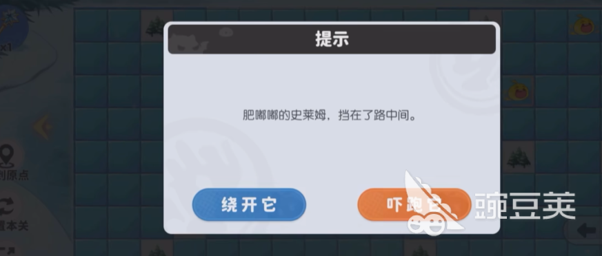 持续向下推进过程中,还将遭遇第二只史莱姆,同样采用“右移一格”方式绕开。完成绕行后,将抵达一个神秘宝箱。使用此前获取的钥匙开启宝箱,切勿继续向前滑行;此时应立即转向下滑,直行至靠近树木边缘处。随后可见右侧存在一块无冰空地区域,进入该区域后,其正下方将显示一面小旗标识——点击该旗帜即可完成通关。