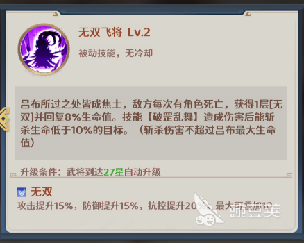 吕布作为核心C位,主动技具备群体真伤与禁疗效果,奥义附带禁止复活机制;其被动技能支持随敌方阵亡数叠加吸血,并赋予对10%以下血量目标的直接斩杀判定,大幅提升清场效率与残局统治力。