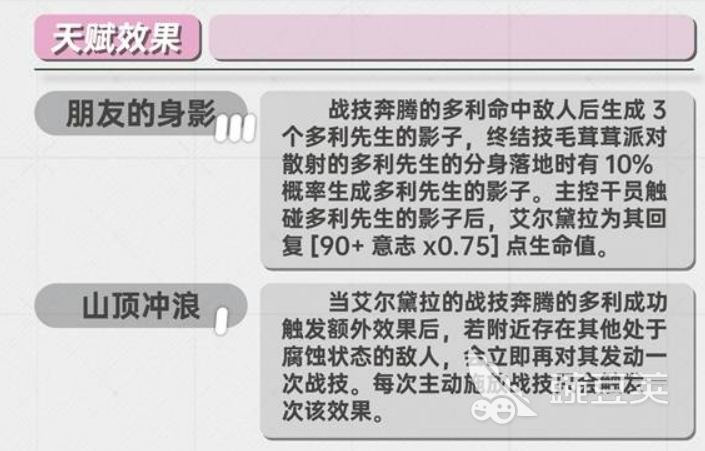 核心天赋这里要重点关注一下。朋友的身影这个天赋挺重要的,主控干员吃到多利先生的影子之后,艾尔黛拉会额外治疗另一个血量最低的队友,虽然只有一半效果,但多一层保障总是好的。还有个天赋是,战技消耗腐蚀后,能施加脆弱效果,提升10%,配合队伍输出很有用。终结技相关的天赋也不错,持续时间加1秒,生成影子概率提升,能量消耗减少15%,这些都能让她的循环更顺畅。