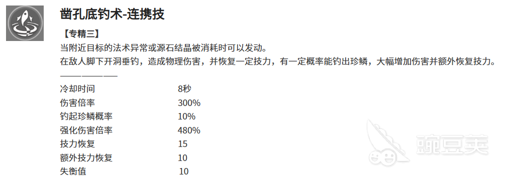 连携技——凿孔底钓术的触发条件是附近目标的法术异常或源石结晶被消耗,冷却8a秒。基础伤害300%倍率,有10%概率钓起珍鳞,触发后伤害提升到480%并且额外回10技力,加上基础的15技力回复,一次连携最多能回25技力。这个技能看起来随机性有点大,但在实际使用中,因为冷却时间短,触发次数多了之后珍鳞出现的频率还算稳定。配合队友频繁消耗异常状态的话,技力回复效率会很高。
