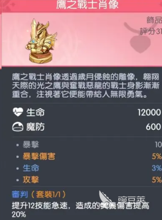 鹰之战士金像:可以有效提升角色伤害的潜力。12,000点生命,还有600点魔防,就能在短时间内提升生存的能力,让角色在团战的过程中就会更加激进的输出。10点暴击,5%的攻击,5%的暴击伤害就可以攻击三个维度,然后全面强化输出。3%的生命加成就能有效提升容错的几率,让他在残血的状态下,照样也可以靠技能去完成反杀,整体的优势还是比较不错的。在团战的过程中,装备的搭配就可以起到辅助提升战斗力的效果,因此无论如何都不要忽视。