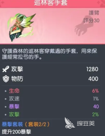 巡林客手套:看上去好像是偏向于物理职业的手套,但在搭配之后效果是比较出色的。1280点攻击属性,可以进一步的提升输出的基础,400点的物理性防护就可以弥补法师身板脆弱的短板。6%的生命加成就能迅速的提升血量,让他不至于被敌方的刺客直接一套秒杀。1%的攻击速度看上去作用不大,不过却可以优化普通攻击衔接技能的手感,让输出的节奏更加的顺滑。真正的关键就在于套装效果的暴击,两件套就可以带来200点的暴击属性,加上暴击加成,那自然会拥有很好的优势。