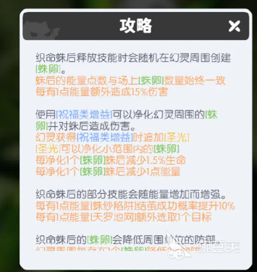 最后那自然就是织命蛛后,主要的机制就是不进化之后就崩盘。蛛后会不断生成蛛卵,不仅可以给自身增加伤害,同时还会有控制效率,能有效降低我方的防御。随着难度的提升,没有清除的话就无法前进,而清除的唯一方法就是依靠祝福类的增益。核心卡建议选择英雄导师,还有烈焰魔女,这两者全部都可以附加士气buff。远古魔像的斗志效果就能迅速的提升队伍的续航,进阶可以选择智慧女神。斗志扛伤能力就可以大幅度的提升生存的能力,拥有更好的优势。