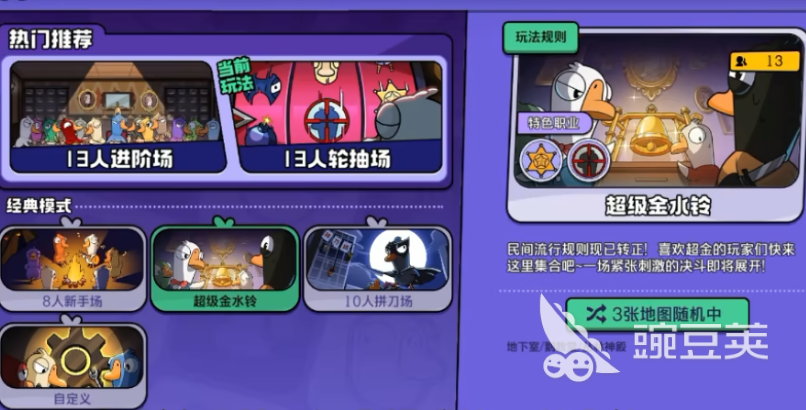 另外还有超级金水铃以及侦探猎场娱乐模式,在超级金水铃模式里,胜利条件是一样的,不同的是在这个模式里,鹅阵营的角色可以发起一次超级会议,在会议里可以和其他成员分别开启对战,挑战的如果是鸭子阵营或者中立阵营,那对方就会直接出局,但如果挑战的是自己阵营里的角色,玩家个人会直接出局,侦探猎场娱乐模式会给每个成员分配随机技能,而且角色可以自行选择是否成为凶手,会让对局难度更高一些。