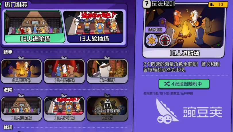 除了有8人模式之外,还有13人轮抽模式,在这个模式里可以参与的角色会更多,不再是系统强制性分配一个角色,而是会给出三个随机角色,成员们可以在里面自由选择一个,通过这种选择设定的成员们,有机会使用自己擅长的身份参与挑战,能提升游戏的胜率,也让整体的难度会更高,13人进阶模式同样需要13名成员,进阶模式身份不能选择,要像8人模式一样让系统自行分配,挑战过程中人数会更多一些,比较适合老玩家尝试。