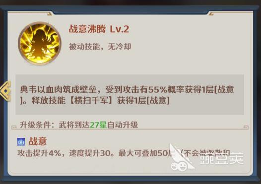 另一被动“战意沸腾”构建其持续作战能力:每次受击有概率获得1层战意,释放主动技能时必定获得1层;每层提供4%攻击力与30点速度加成,上限50层,且该效果不可被驱散、不可被偷取,确保成长过程绝对稳定可靠。