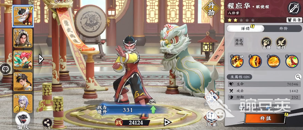 最后推荐角色为程应华。其核心优势在于顶级生存能力与武魂品质(优品),八卦掌技能不仅提供可观掌法伤害,还附带基于伤害量的生命回复效果。该角色特别适配“以少打多”场景,例如高难度悬赏任务或跨战力挑战副本,其技能链具备自我续航、持续压制与战术拉扯三重特性,对配队协同性要求较高,但成型后综合强度极为突出。